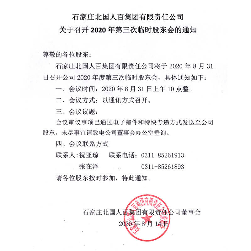 石家莊北國人百集團有限責任公司關(guān)于召開2020年第三次臨時股東會的通知