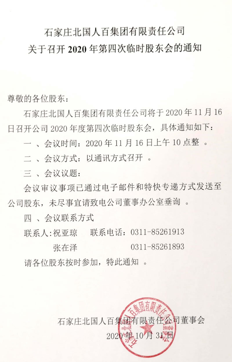 石家莊北國人百集團有限責任公司關(guān)于召開2020年第四次臨時股東會的通知