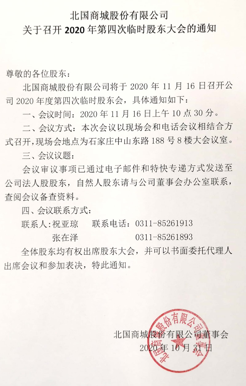 北國商城股份有限公司關(guān)于召開2020年第四次臨時(shí)股東大會(huì)的通知