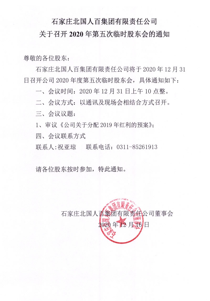 石家莊北國(guó)人百集團(tuán)有限責(zé)任公司關(guān)于召開(kāi)2020年第五次臨時(shí)股東會(huì)的通知
