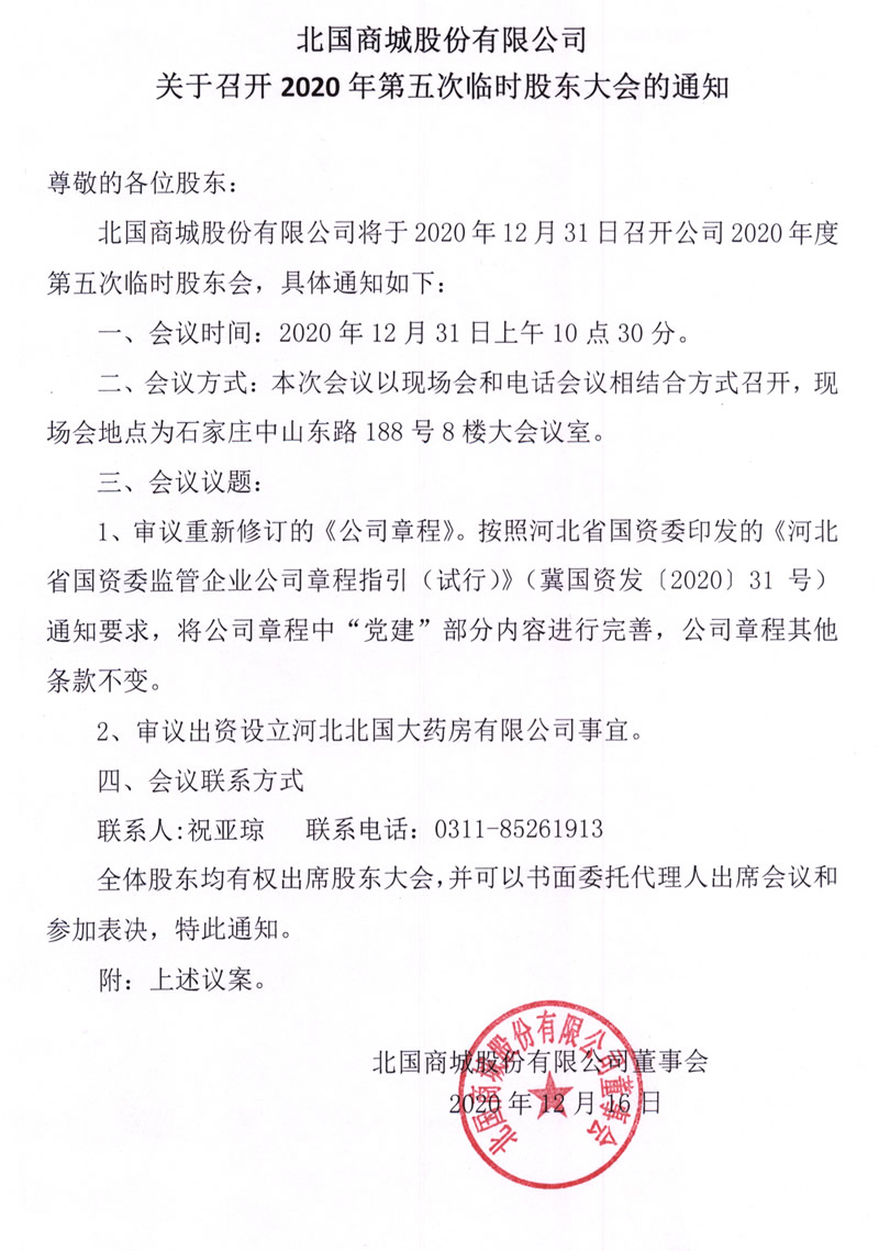 北國(guó)商城股份有限公司關(guān)于召開(kāi)2020年第五次臨時(shí)股東大會(huì)的通知