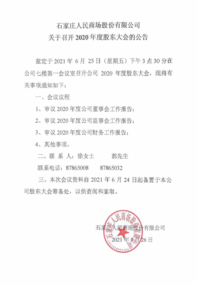 石家莊人民商場股份有限公司關(guān)于召開2020年度股東大會的公告