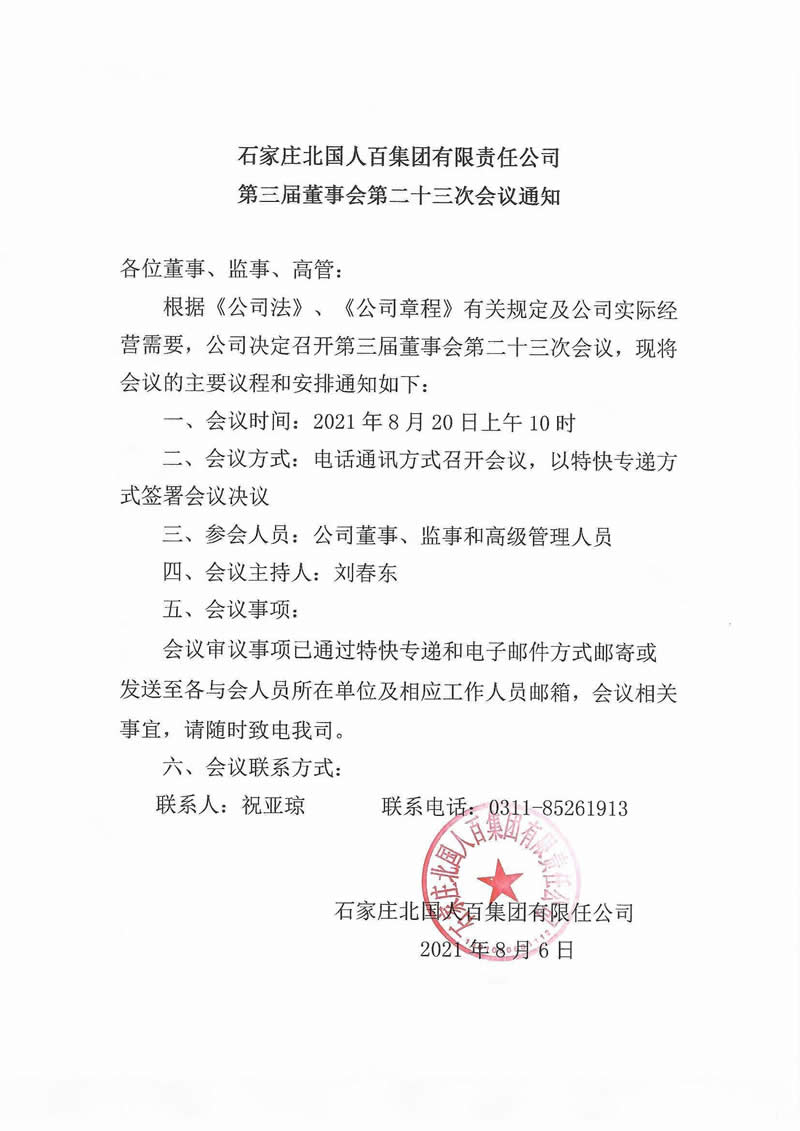 石家莊北國人百集團(tuán)有限責(zé)任公司第三屆董事會第二十三次會議通知