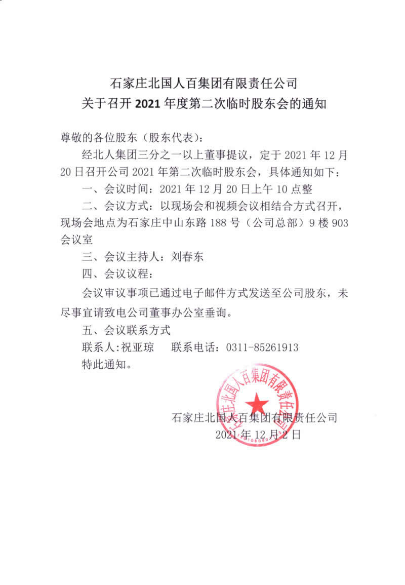 石家莊北國人百集團(tuán)有限責(zé)任公司關(guān)于召開2021年度第二次臨時(shí)股東會(huì)的通知