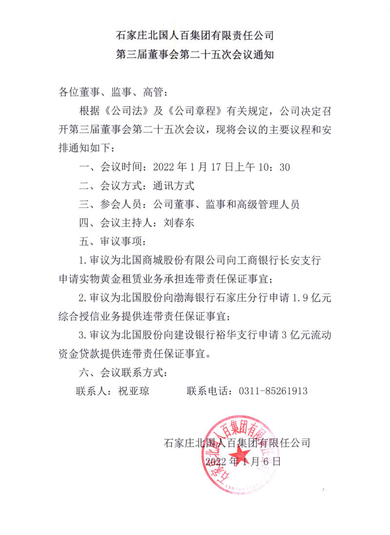 石家莊北國人百集團有限責(zé)任公司第三屆董事會第二十五次會議通知