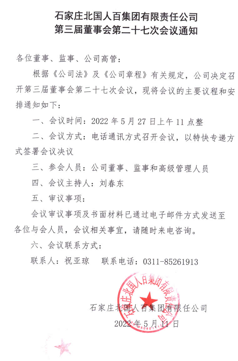 石家莊北國人百集團(tuán)有限責(zé)任公司第三屆董事會第二十七次會議通知
