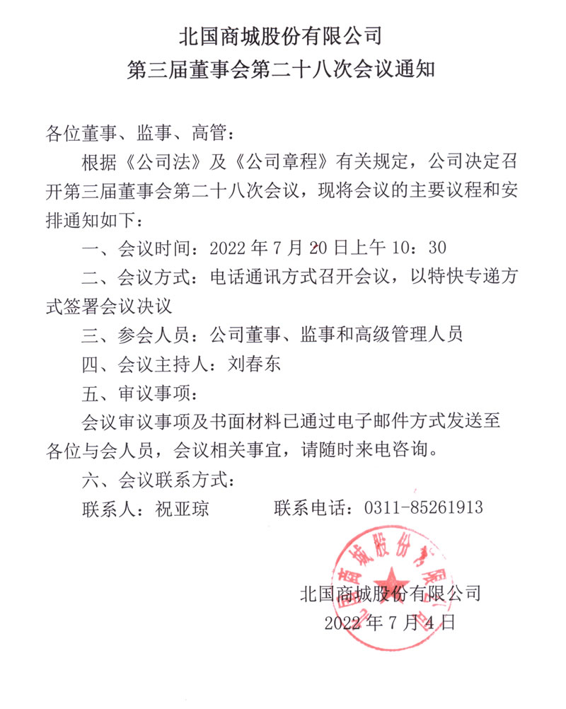 北國(guó)商城股份有限公司第三屆董事會(huì)第二十八次會(huì)議通知