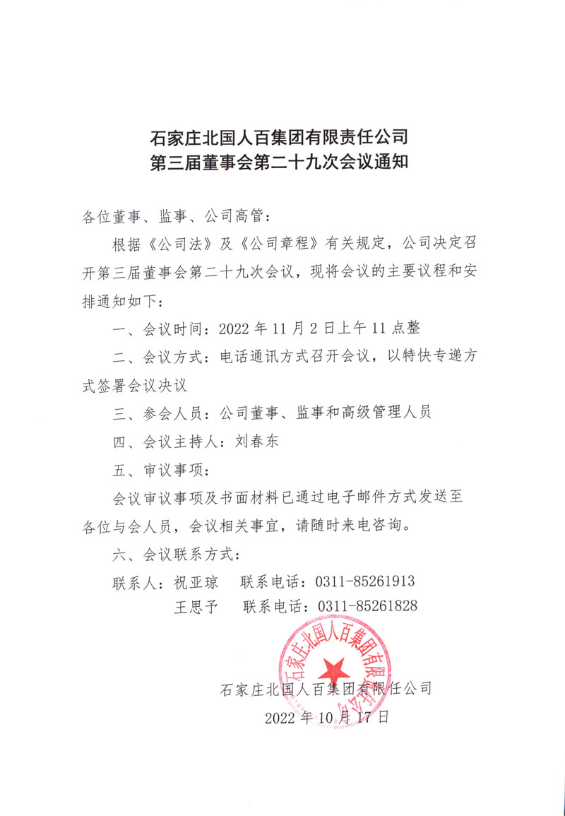 石家莊北國(guó)人百集團(tuán)有限責(zé)任公司第三屆董事會(huì)第二十九次會(huì)議通知