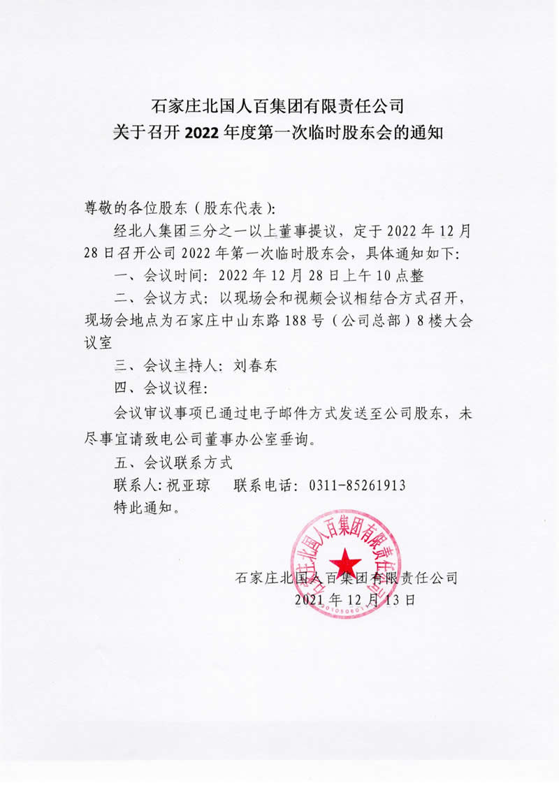 石家莊北國(guó)人百集團(tuán)有限責(zé)任公司關(guān)于召開(kāi)2022年度第一次臨時(shí)股東會(huì)的通知