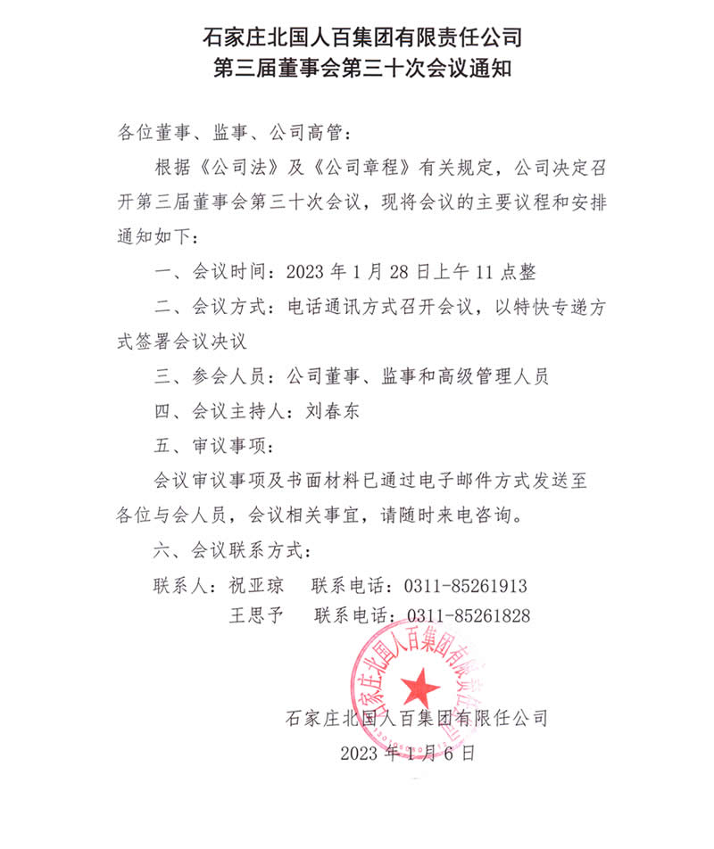 石家莊北國人百集團有限責任公司第三屆董事會第三十次會議通知