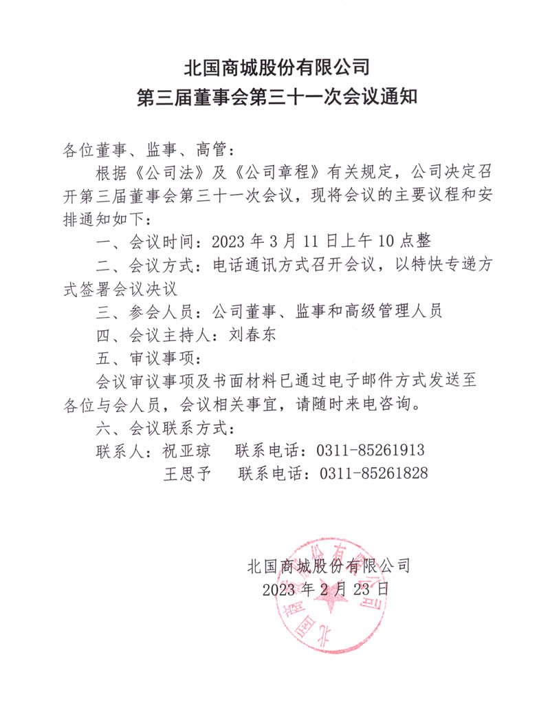 北國商城股份有限公司第三屆董事會第三十一次會議通知