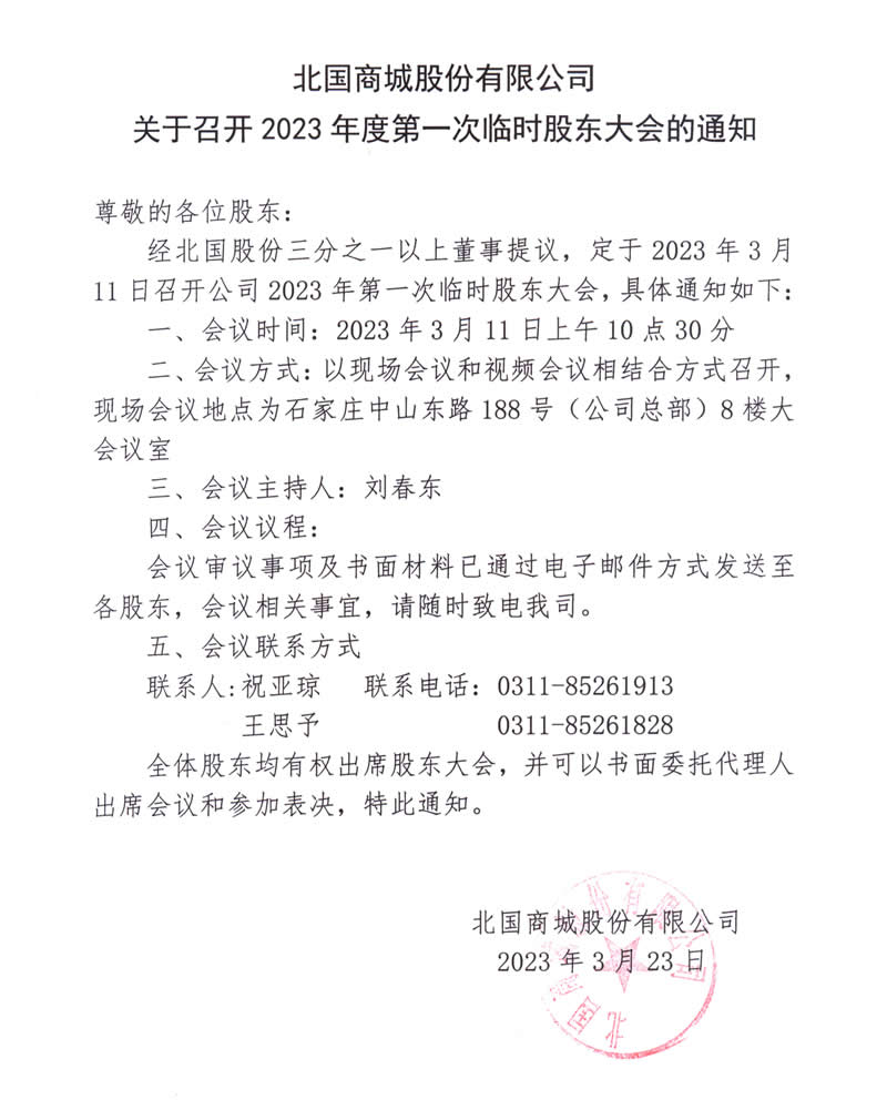 北國(guó)商城股份有限公司關(guān)于召開2023年度第一次臨時(shí)股東大會(huì)的通知