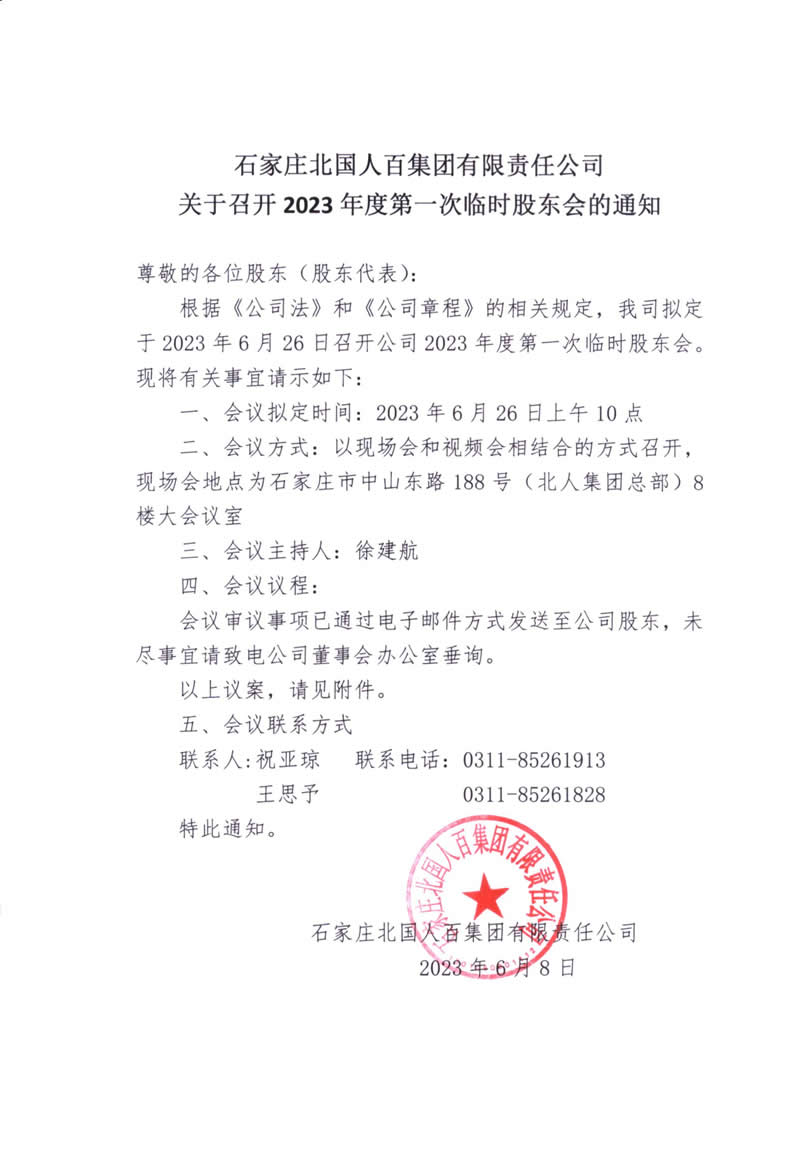 石家莊北國(guó)人百集團(tuán)有限責(zé)任公司關(guān)于召開2023年度第一次臨時(shí)股東會(huì)的通知