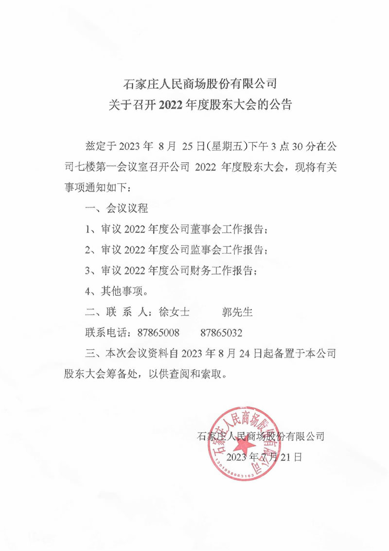 石家莊人民商場股份有限公司關(guān)于召開2022年度股東大會的公告