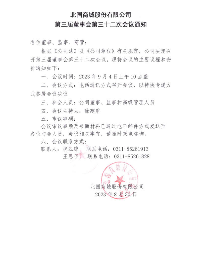 北國商城股份有限公司第三屆董事會第三十二次會議通知