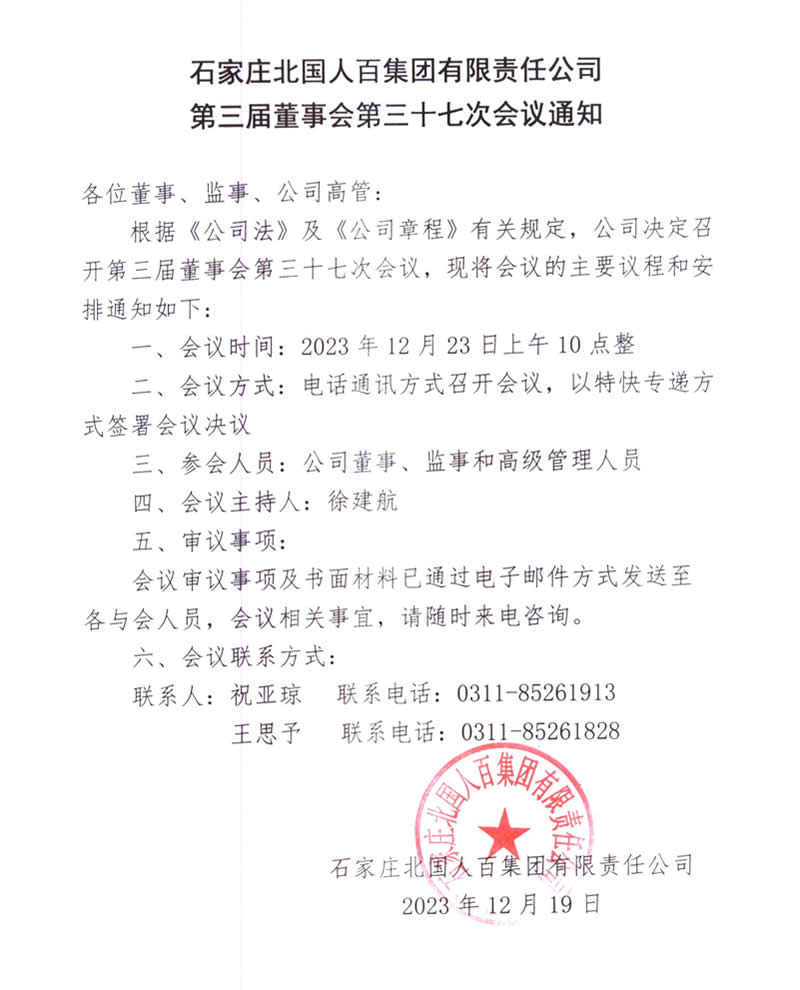 石家莊北國人百集團有限責(zé)任公司第三屆董事會第三十七次會議通知