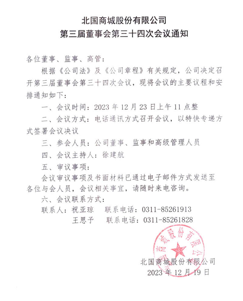 北國商城股份有限公司第三屆董事會(huì)第三十四次會(huì)議通知