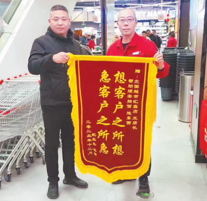 一天上午我正在一樓巡視工作,看見一位老大爺推著一袋面,動(dòng)作看上去很吃力,我立即上前詢問:“大爺,有什么我能幫您的嗎?”大爺說:“買了一袋面粉,到這兒搬不走了!”“小事,我?guī)湍帷蔽乙粡澭樖志桶衙娣劭傅郊缟稀!按鬆,您的車子在哪?我給您送過去!贝鬆斶B連說:“就在前面,太感謝你了,小伙子慢一點(diǎn)。 蔽野衙娣劢o大爺送到三輪車上后,表示想給大爺送回家,大爺說什么都不讓!斑@就夠麻煩你的了,可不能再耽誤你工作了!蔽艺f:“不麻煩,這也是我的工作!贝鬆斣偃硎靖兄x,就是不讓送,我目送老人家慢慢騎走三輪車后,就回到了工作崗位。幾天后,一位顧客來到服務(wù)臺(tái),員工熱心接待后得知是大爺?shù)募胰。顧客說老人回家后一直說北國員工真好,今天是特意受大爺?shù)奈杏H自到店表示感謝并贈(zèng)送錦旗的。