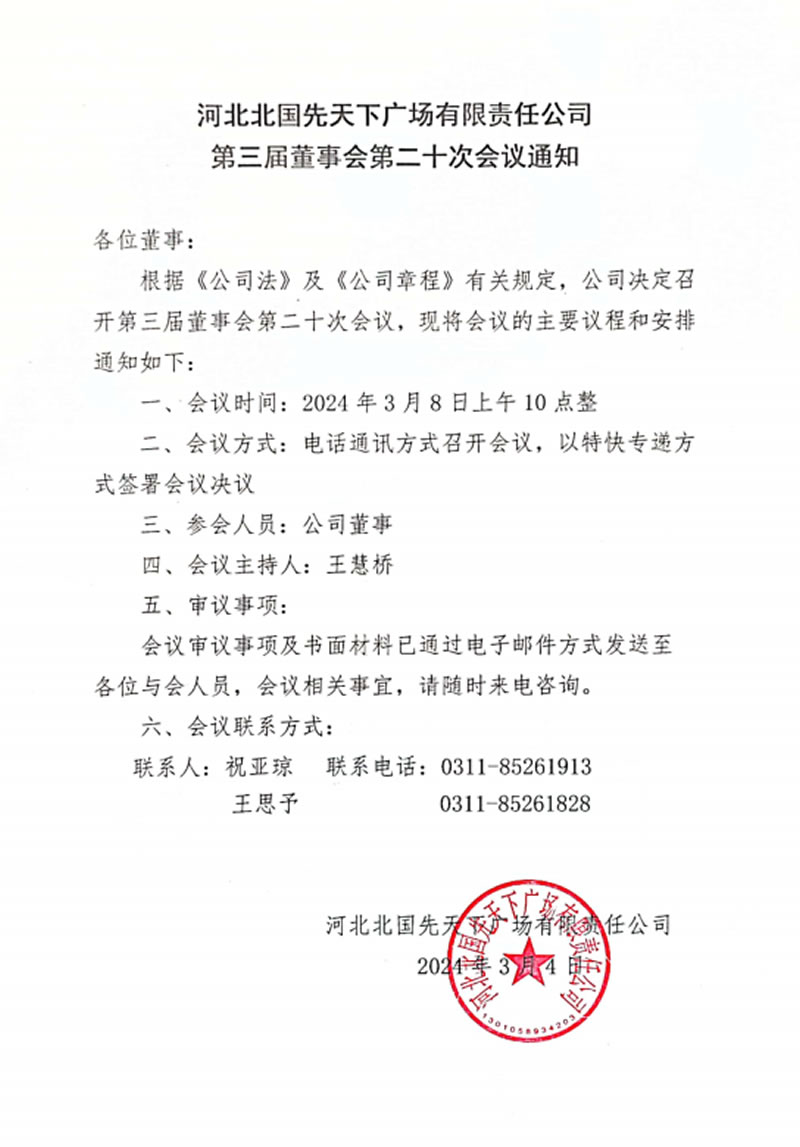 河北北國先天下廣場有限責任公司第三屆董事會第二十次會議通知