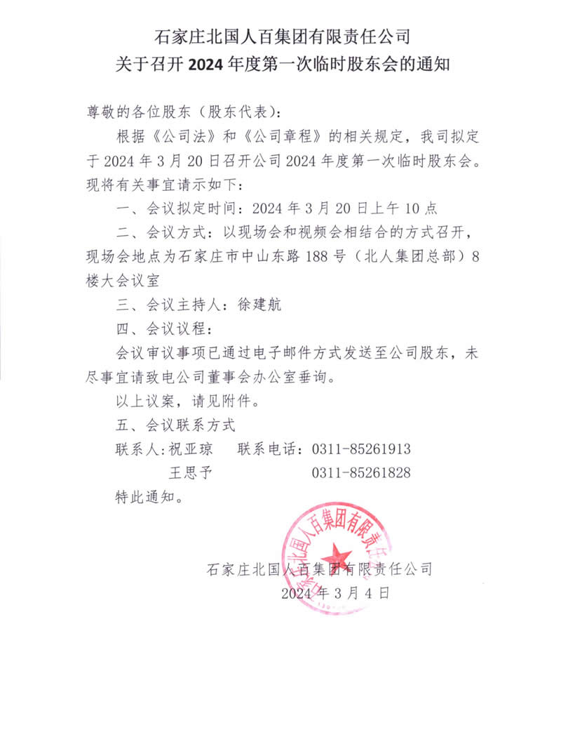 石家莊北國人百集團有限責任公司關于召開 2024 年度第一次臨時股東會的通知