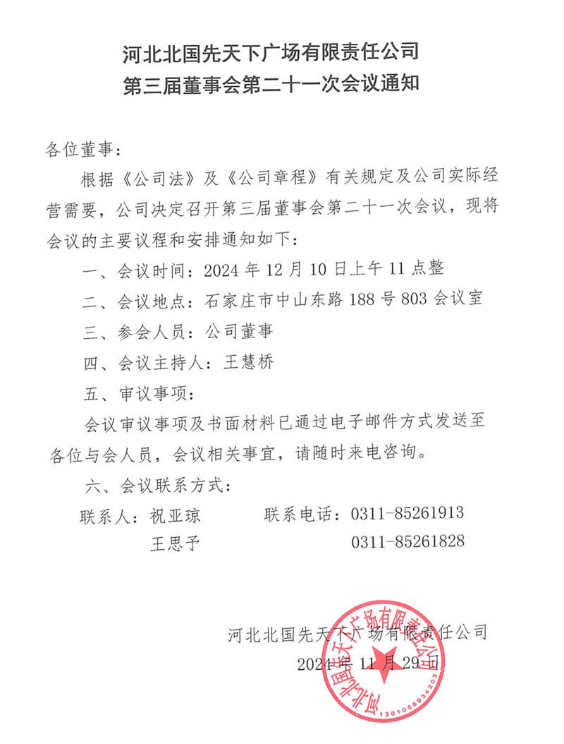 河北北國先天下廣場有限責任公司第三屆董事會第二十一次會議通知