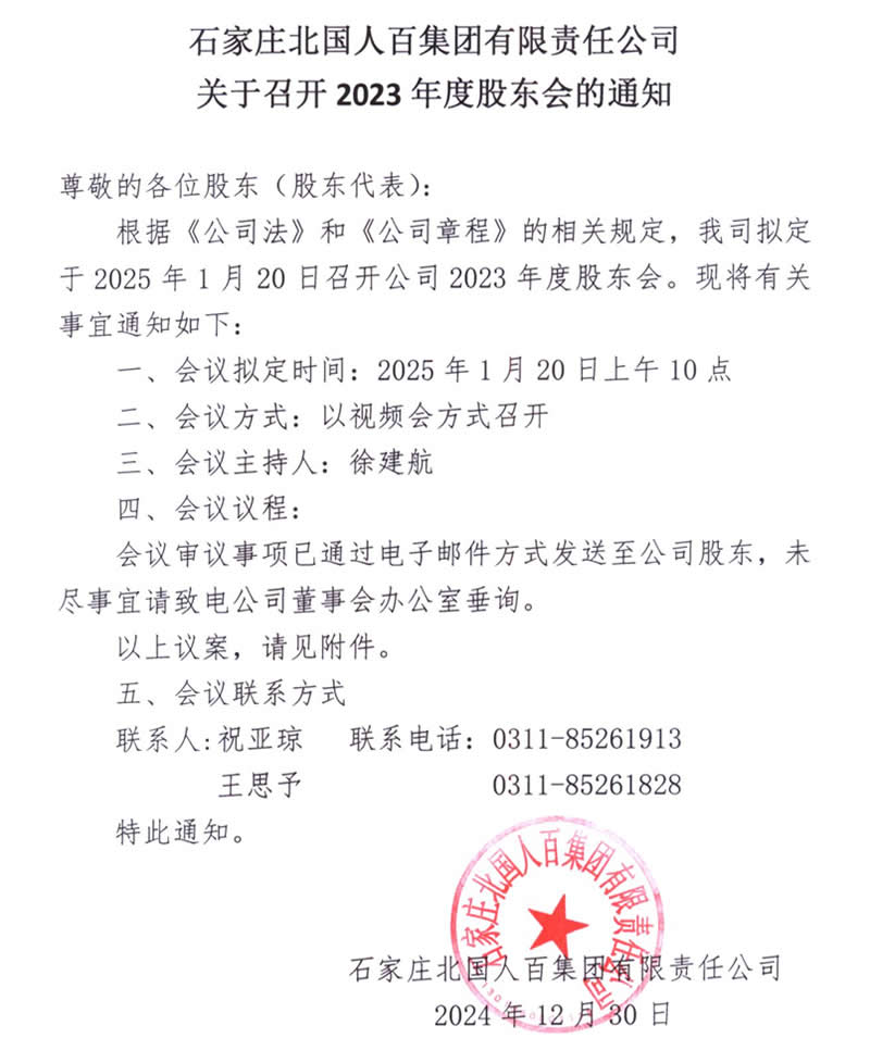 石家莊北國人百集團有限責任公司關(guān)于召開2023年度股東會的通知