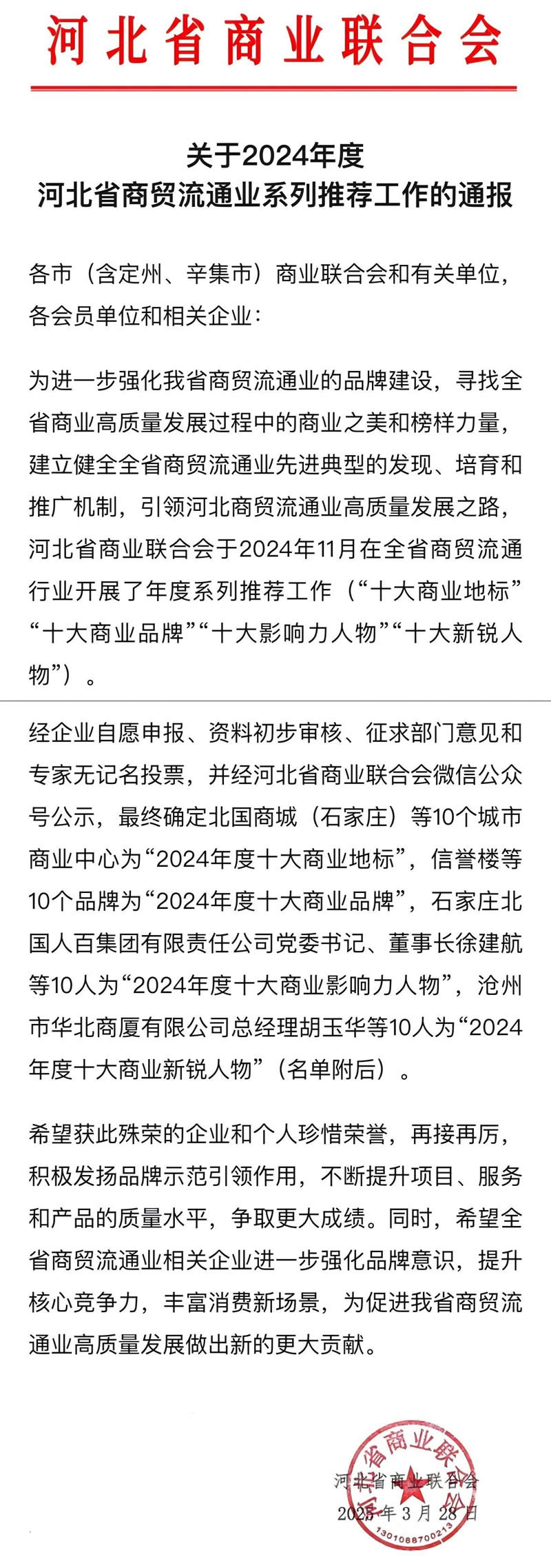 為進一步強化河北省商貿(mào)流通業(yè)品牌建設(shè),尋找全省商業(yè)高質(zhì)量發(fā)展過程中的商業(yè)之美和榜樣力量,建立健全全省商貿(mào)流通業(yè)先進典型的發(fā)現(xiàn)、培育和推廣機制,引領(lǐng)河北商貿(mào)流通業(yè)高質(zhì)量發(fā)展之路,河北省商業(yè)聯(lián)合會在全省商貿(mào)流通行業(yè)開展年度系列推薦工作。經(jīng)評選,北人集團黨委書記、董事長徐建航被評為“2024年度十大商業(yè)影響力人物”。集團旗下北國商城、北國先天下被選為“2024年度十大商業(yè)地標”。