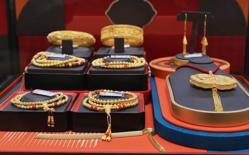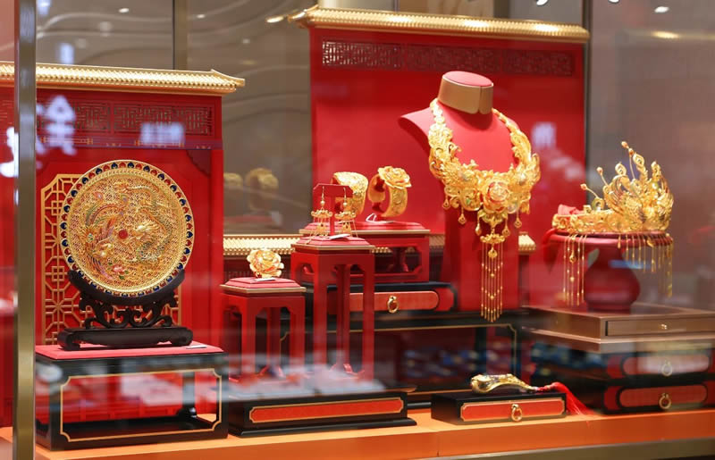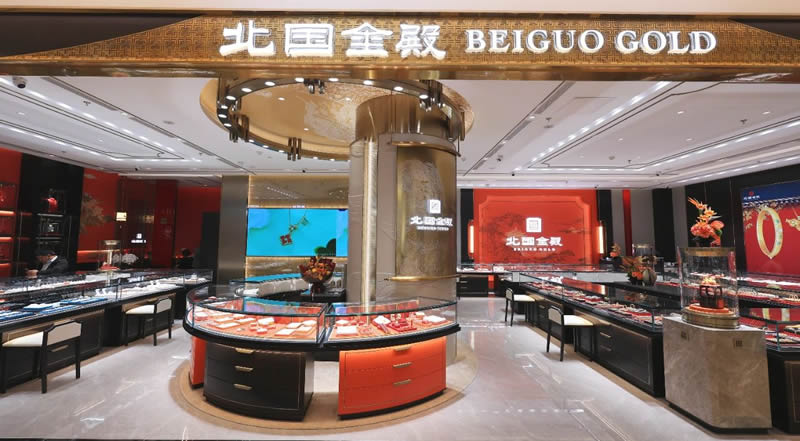 北國金殿全新開業(yè)后,門店形象、貨品呈現(xiàn)、服務(wù)能力全面升級,打造“宮殿級”美學(xué)空間與創(chuàng)新服務(wù),將中華文化的歷史底蘊(yùn)與當(dāng)代時尚相融,打破傳統(tǒng)金店封閉陳列,以故宮宮殿建筑美學(xué)為藍(lán)本,擷取宮廷配色作為北國金殿色彩搭配美學(xué),將斗拱結(jié)構(gòu)化作展柜線條,呈現(xiàn)古香古韻的美感。