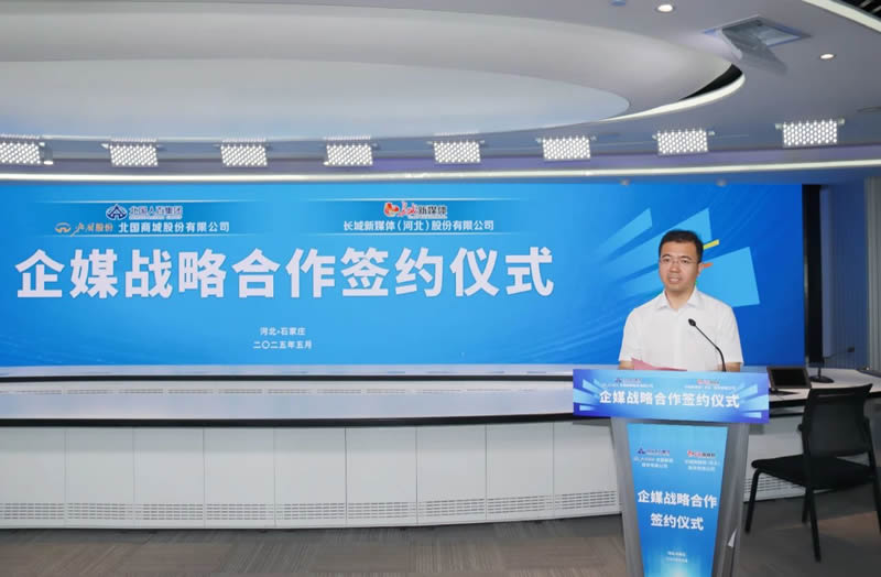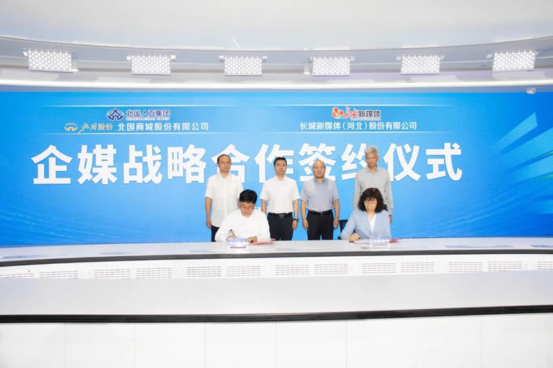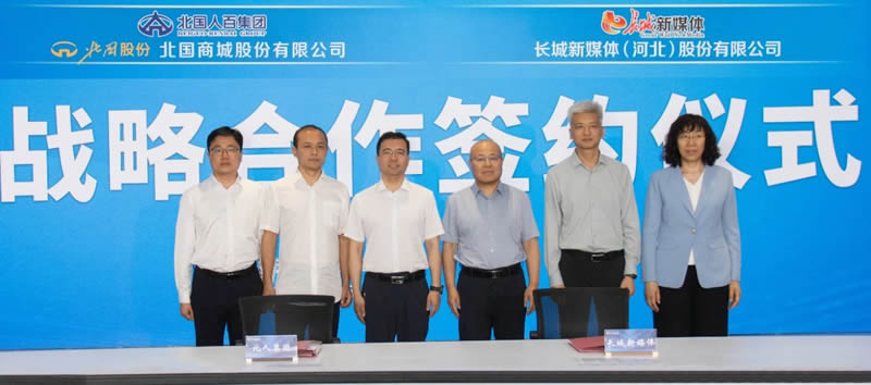5月20日上午,北國商城股份有限公司與長城新媒體(河北)股份有限公司在冀云·融媒體中心簽署戰(zhàn)略合作協(xié)議。長城新媒體集團(tuán)黨委書記、董事長郭新耀,黨委副書記、總編輯王悅路,黨委委員、副總編輯邵荃,長城新媒體(河北)股份有限公司總經(jīng)理賈芳,北人集團(tuán)黨委書記、董事長徐建航,黨委副書記、董事、工會(huì)主席趙雪飛,黨委委員、副總經(jīng)理劉雋,北國商城股份有限公司黨委副書記、董事、工會(huì)主席王浩等出席簽約儀式。